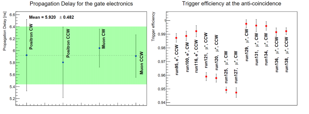 Fig. 4 left: propagation delay of the fast electronics; right: trigger efficiencies.