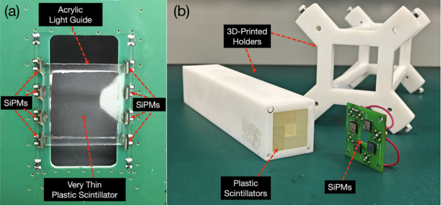 The first step, reported in Radiation Detection Technology and Methods (2025), described the design and beam testing of a prototype trigger detector consisting of a 100 µm-thin gate scintillator and a surrounding telescope array, both read out by silicon photomultipliers (SiPMs). Using 27.5 MeV/c muons at PSI’s πE1 beamline, the team measured high timing precision, optimal light yield, and excellent agreement with Geant4 simulations, confirming the system’s ability to select storable muons while rejecting background particles.